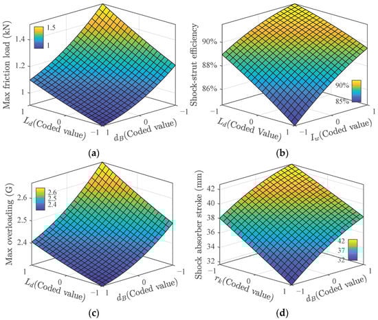 Figure 11 illustrates the top two noticeable variables affecting the four landing responses while the coded values of other variables are set to be zero. The top two sensitive variables for the max friction load and the max overloading are the distance between the lower bearing and wheel axis (), and the lower bearing width (). The similarity of variation trend in Figure 11a,c also demonstrates the correlation between these two landing responses. In Figure 11a,c, when the value of the lower bearing width () at a low level, the response value increases rapidly as the lower bearing width () decreases and the distance between the lower bearing and wheel axis () increases, proceeding toward an unfavorable level. Moreover, when the value of the lower bearing width () at a high level, the values of these two landing responses are at a stable and favorable level.