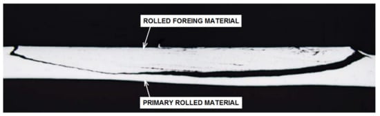 Defects are classified according to different criteria. For the purposes of this work, they were classified into the following categories: technological, material, and other defects. Technological errors include defects caused by the design of equipment where the surface of the strip is mechanically damaged, as well as errors caused by the technological process of production itself, such as low temperature, poor speed, and poorly set rolling forces []. Material defects are understood to signify defects of metallurgical origin, i.e., the influence of the chemical material composition. They can be caused by improper handling or defects during the transport of material []. Other errors include the effects of ambient temperature, energy supply effects, line downtime, humidity, aggressive environment, or human factors []. In the case of rolled foreign material, it is difficult to determine which category it clearly belongs to. This is a technological and material defect. The cause results from the nature of the technological process (technology of rolling). Rolled foreign material can be referred to as a material (element) that has entered the primary material during the rolling process. It is characterized by a different chemical composition or other mechanical properties, and its origin is different from the origin of the primary rolled material. This is a material that is not related to the primary material. Such foreign materials may be, for example, scale, foreign objects (such as screws and nuts), or a fragment from a loose part of the rolling mill (e.g., pieces of pertinax plates).