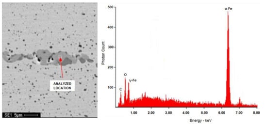 In Figure 3 (left side), the arrow indicates the location analyzed. It is clear from the figure that this differs from the surrounding material. The second part of the figure shows the representation of the chemical elements carbon (C), oxygen (O), and iron (γ-Fe and α-Fe). This proves that these are steels from the hot rolling process. The hot rolling process was determined by identifying the location of the problem. In this way, the individual parts of the hot rolling mill line had to be analyzed. The question arose as to whether the occurrence and rolling of foreign material could be caused by rotating or static parts. The influence of rotating parts was excluded due to the occurrence of the rolling of foreign material. If an error were caused by a rotating part, its occurrence on the rolled strip would have to be caught repeatedly []. This has not yet been confirmed. By excluding rotating parts, the large number of possible causes of the error were significantly reduced. In the case of static parts (from blast furnaces to winders), only two were under consideration, namely: