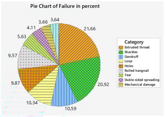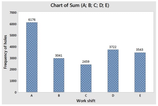 The analysis of the influence of the human factor included an examination of individual work shifts. The analysis of work shifts (Figure 5) showed that the frequency of errors was influenced by individual work changes. The results show that the lowest occurrence of holes was observed during work shift C. The difference between the lowest and highest incidence between changes was more than 60%.