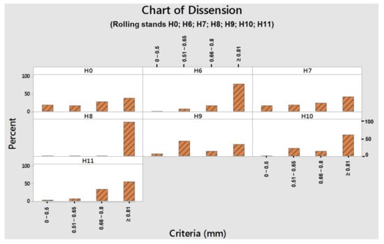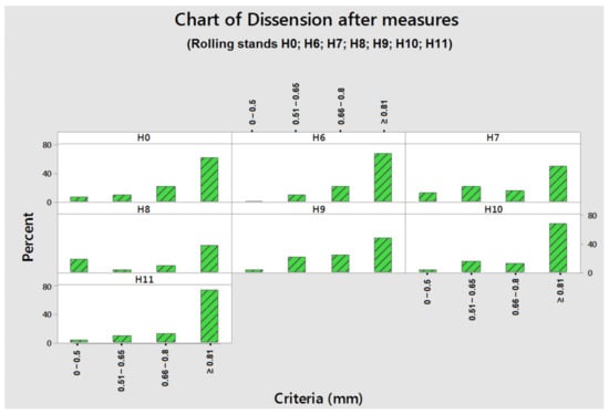 Figure 6 shows that the worst case (≥0.81 mm—Values in nonconformity) was on rolling stands H6 and H8. Rolling stand H11 also showed poor conditions. Values ≥ 0.81 mm show a level of more than 50%, and values in the range 0.66 – 0.8 mm reached a level of 35%.