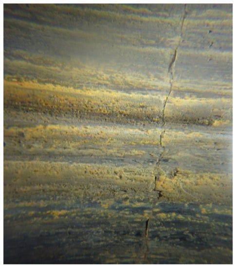 An experimental design based on all the analyses described above aimed to change the material of the guide rails. The rulers were a place where foreign material accumulated. After its accumulation, it loosened and was subsequently rolled during the rolling of the primary material. Changing the material of the guide rails could eliminate this issue. The request to change the material of the rulers was addressed to an external supplier. The basic requirements included higher abrasion resistance at high temperatures, high resistance to cyclic heat loading, higher hardness, and, at the same time, sufficient toughness. Under such requirements, the properties of the rulers would ensure their long life while significantly reducing the occurrence of rolling of foreign material. The requirements for the properties of the rulers were demanding. After 3 months, the external supplier supplied new rulers for experimental testing. Testing took place with increased control of their technical condition. After 3 days of use, cracks appeared on the rulers, which were not technologically acceptable. A detailed image of a crack is shown in Figure 7, and after analysis, it was found that this crack travelled transversely in the direction of rolling over the entire surface of the ruler, and was not even visible in some parts, i.e., it was distributed within the material.