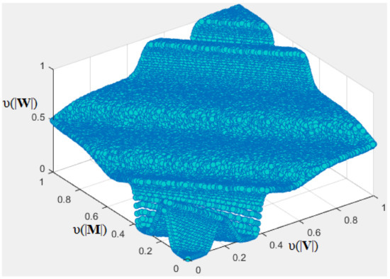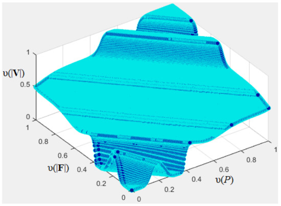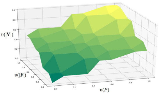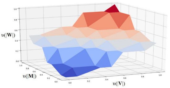 Now, based on Equations (15)–(20), the HA rule base of |V| and of |W| in Table 4 and Table 5 are transformed into the semantic relationships as presented in Table 6 and Table 7. The semantic relationship between |F|, P, and |V| in Table 6 defines the super surface in Euclidean space, as shown in Figure 1. The semantic relationship between |M|, |V|, and |W| in Table 7 defines the super surface in the Euclidean space, as shown in Figure 2. Super surfaces in Figure 1 and Figure 2 are obtained from the linearization of Table 6 and Table 7 by using the four-point bilinear method.