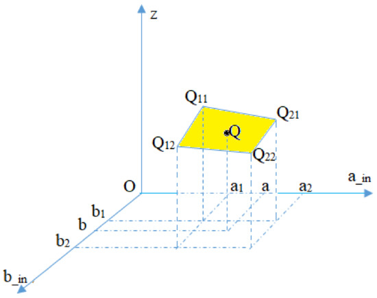 The four-point bilinear interpolation. Here, Q11 = (a1, b1, z11), Q12 = (a1, b2, z12), Q21 = (a2, b1, z21), Q22 = (a2, b2, z22), and Q = (a, b, zq).