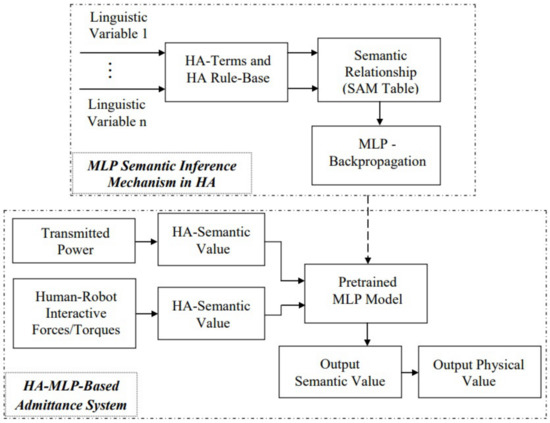 As presented in the fourth paragraph of the Introduction section, the MLP network is chosen for the semantic input–output relationship in the HA based on its properties. The proposed MLP-HA-based admittance solution is presented in Figure 4, including two main blocks: the MLP semantic inference mechanism in HA and the MLP-HA-based admittance system. In the MLP semantic inference mechanism in HA, HA-terms and HA rule-base are defined based on requirements of engineering problems. In addition, in this paper, they are presented in Table 3, Table 4 and Table 5 to solve several issues of pHRI. The semantic relationship is presented in Table 6 and Table 7. These relationships are then described by the MLP network, which is trained using backpropagation. This MLP network will be used as an interpolation method for the input–output semantic relationship in the HA-MLP-based admittance system.