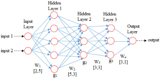 The configuration of the MLP network is characterized by the number of hidden layers and the number of neurons in hidden layers, the number of samples propagated through the network for each gradient update, the number of trained epochs, and the learning rate. The studies based on the theorems of Kolmogorov, for example, Refs. [43,44,45], have pointed out that all of the continuous mappings from [0, 1]p to [0, 1]n can be approximated by a multilayer perceptron network of which input layer includes p neurons, output layer includes n neurons, and hidden layers include (2p + 1) neurons. However, the number of samples in the training data set is also an important factor in choosing the MLP configuration with well-fitting and capacity. To choose the configuration of the MLP network, the recommendation in [49,50] is used: