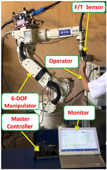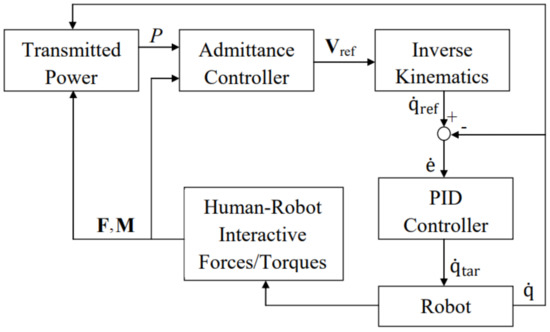 The safe, natural pHRI can be considered an efficient solution for enhancing flexibility and reducing human labor in industrial processes. For example: (a) the operator teaches the manipulator to implement complicated tasks, such as welding, whose purpose is to eliminate the path planning, or (b) the manipulator supports the operator to lift heavy objects up and down. The quality of pHRI depends on three issues: identifying inertia and damping matrices (IIDM), safety, and natural cooperation. To date, almost all studies have concentrated on the safety issue, while the IIDM is still an open problem since this work cannot be obtained analytically and is usually time-consuming. Moreover, the natural human–robot interaction is rarely of concern, yet it is crucial to obtain effective cooperation. These shortcomings can be found in previous studies on pHRI, such as [1,2,3,4,5,6,7], and are presented clearly in [8,9,10]. By contrast, the natural human–robot cooperation is considered elaborately for non-physical interactions, as presented in [11,12].