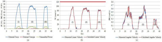 Experimental results using Bi-HA-based admittance controller, (a) presents the inputs |F| (N), |M| (Nm) and P (W); (b) and (c) present outputs |V| (mm/s) and |W| (rad/s), respectively.