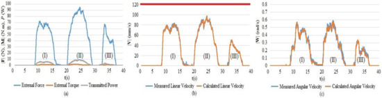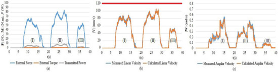 In addition, the proposed admittance controller uses the transmitted power as an additional input, which is the dot product of the external wrench vector and the actual velocity vector, whose purpose is to avoid the direct map from external forces/torques to linear/angular velocities. As presented, the natural human–robot interaction is also considered in this paper. Therefore, the velocity of end-effector and external forces include both linear and angular elements. Normally, the rotation elements have bigger effects on the stability and accuracy than translation elements since a small change of the rotation can lead to a big error. This observation raises the need to create a relationship between linear velocity and angular velocity to guarantee smooth cooperation. Based on this point, the linear velocity is calculated first based on translation elements of the external wrench and transmitted power, then the angular velocity is calculated based on the linear velocity and rotation elements of the external wrench. As shown in Equation (2), the value of transmitted power depends on Vk−1, Wk−1, F, and M. As a result, the value of the actual velocity will not change suddenly even when the external wrench changes sharply. By doing this, the jerk during cooperation is reduced.