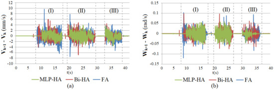 The mean of velocity step for each admittance controller is presented in Table 8; for the proposed MLP-HA-based admittance controller, the linear velocity step is 0.3757 mm/s, and the angular velocity step is 0.0042 rad/s, whereas the linear velocity steps are 0.4647, 0.6498 mm/s and angular velocity steps are 0.0054, 0.0062 rad/s for the Bi-HA-based and fuzzy-based admittance controllers, respectively. In addition, for the proposed MLP-HA-admittance controller, the percentage errors of linear velocity and angular velocity are 3.19% and 6.6%, respectively. These percentage errors increase to 3.52% and 8.1% for the Bi-HA-based admittance controller, 4.56% and 9.24% for the fuzzy-based admittance controller. In Figure 13, maximum steps of linear and angular velocities are about 4 mm/s and 0.05 rad/s for the proposed MLP-HA-based admittance controller, whereas those values are around 6 mm/s and 0.1 rad/s for Bi-HA-based admittance controller, and approximate 10 mm/s and −0.1 rad/s for fuzzy-based admittance controller, respectively. This analysis has shown that the proposed MLP-HA-based, Bi-HA-based and fuzzy-based admittance controllers give favorable conditions to avoid instability during the cooperation even when the external wrench is suddenly changed. Moreover, the MLP-HA-based admittance controller provides better cooperation compared to other admittance controllers. In addition, even if the external wrench is larger than the allowed value, the velocity of the end-effector always belongs in a safe domain as the applied values of the external wrench in every DOF in the interactive space are always constrained based on the ISO10218 standard to guarantee safe and natural pHRI.