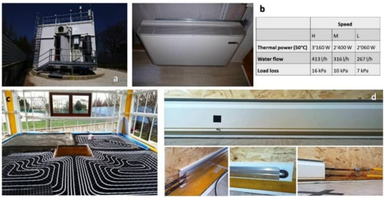 Experimental equipment: (a) matrix; (b) fan-coil unit; (c) radiant floor system; (d) heating baseboard.