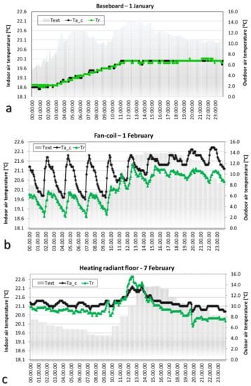 Figure 2 reports the trends of the outdoor (Text) and indoor air temperature (Ta_c) and the mean radiant temperature (Tr) recorded by the sensors in the center of the room.
