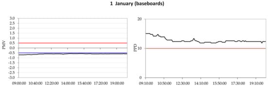 Considering the calculated value of operative temperature, starting from the measurements of the black globe in the room center, it ranged between 18.6 °C and 20.1 °C when the baseboards were active, with an average daily value of 19.6 °C, which did not match with the comfort requirements. The relative humidity varied between 43% and 53%. As shown in Figure 3, the calculated values of PMV and PPD for typical working hours in a public office were outside the comfort range with a percentage of dissatisfied people from 12% to 24%. The calculation was done considering the measurements of air speed during the selected day.