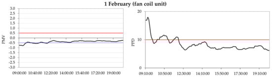 With fan-coils turned on, the operative temperature varied between 19.3 °C and 21.7 °C with an average daily value of 20.7 °C; thus, it was included in the comfort zone. The relative humidity varied between 36% and 40%, with an average daily value of 40%. According to Figure 4, the value of the predicted mean vote was always near the lower limit, but the percentage of dissatisfied people was under 10% starting from the early afternoon.