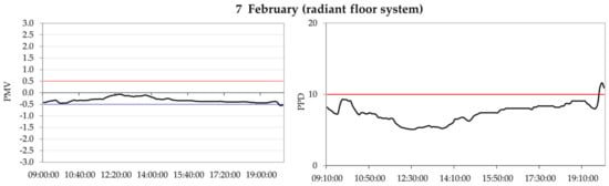 Figure 5 indicates the major attitude of the radiant system to maintain more stationary conditions. The neutral point was very close during the late morning and afternoon; instead, starting from 20:00, the PMV values tended to −0.5 also if the temperature was near 21 °C with a low level of relative humidity (35–37%). In this case, the operative temperature was varied between 20.4 °C and 22.5 °C, and the average daily value was 21.1 °C, while the average daily relative humidity was 39%.