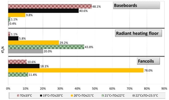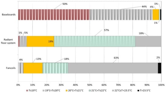 The comfort range for operative temperature (19–23.5 °C) was divided into several intermediate bands in order to discretize the analysis of monitored data in the room center. The Figure 6 shows the percentage of time in which the calculated value (starting from monitored air temperature and radiant temperature) falls within these ranges, considering the whole monitoring period for the three systems.
