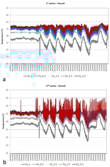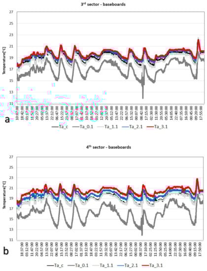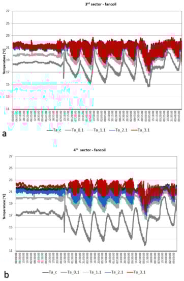 The second part of the proposed elaboration concerns the analysis of air temperature distribution in the four sectors individuated in the test-room, taking into consideration that fan-coils were located in the 2nd sector (right window side) and in the 4th sector (left door side). Instead, the baseboards were located on the walls without the door and the window. The same monitoring periods presented in the previous section were considered.