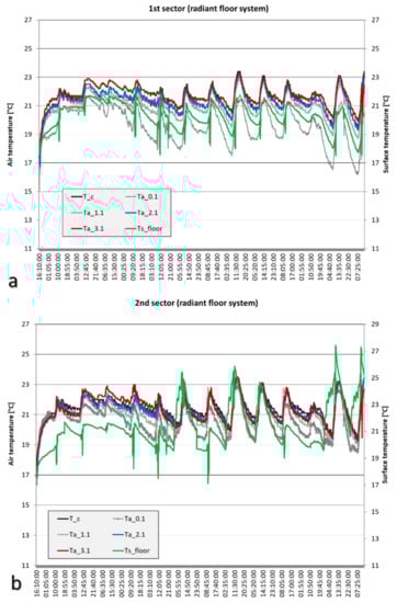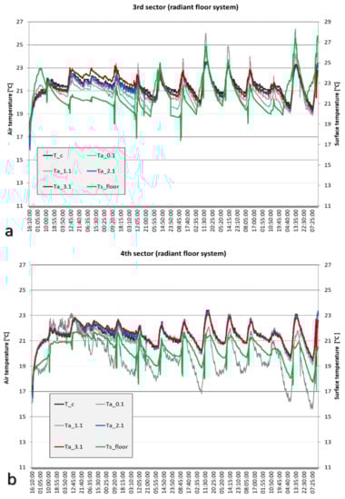 The same analysis was proposed for the radiant floor system for which also the surface temperature was shown. The monitored data for the first and second sectors are proposed, respectively, in Figure 11a,b; the profiles for the other sectors are reported in Figure 12.