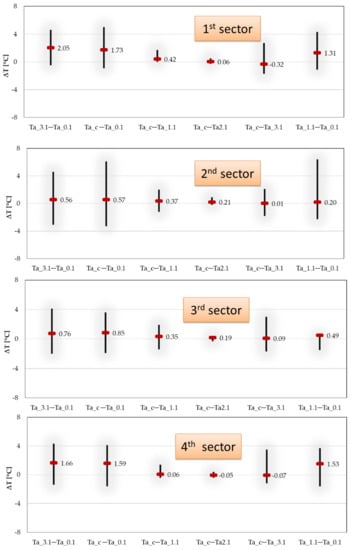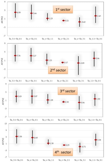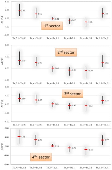 Considering the sensor at 0.1 m, the difference was higher (also 26–31%), with maximum values in the 2nd sector and 3rd sector where Tc − Ta_0.1 was, respectively, +5.7 °C and 6.10 °C.