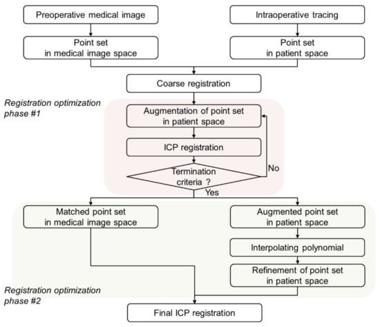 In general, medical images include a large number of points due to their high resolution. However, the point cloud in patient space is determined by the duration of the facial tracing and the available camera samples of the surgical probe. Due to practical limitations, it is difficult to obtain a large number of points in real surgical situations. Therefore, starting with the point cloud obtained by tracing, the point cloud is augmented using an interpolation technique and the surface registration performance is evaluated according to the precise registration process (Figure 1). Here, the point cloud is increased by 5% compared to the previous step. Furthermore, the precision registration method utilizes the ICP method, which is the most widely utilized method (see Section 2.3 for details). The surface registration error (SRE) is evaluated according to augmentation of the point cloud, and the termination criteria are set when the absolute value of the difference in SRE between two consecutive ICPs in the current and previous steps is within 0.1%.
