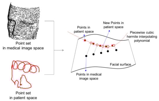 In the second step, the proper point cloud is extracted to match the medical image-based spatial point cloud using the augmented point cloud in patient space (Figure 2). An interpolation polynomial is extracted based on the point cloud, and a virtual point cloud that satisfies the minimum distance to each point in the corresponding medical image space in the previous step (registration optimization phase #1) is extracted. In this study, the piecewise cubic Hermite interpolation method is used, which maintains a polynomial form consisting of coordinate points with less overshoot and undershoot [23]. The process of converting the interval of to intervals of and obtaining the coefficients , , , of the arbitrary cubic polynomial is shown below [24].