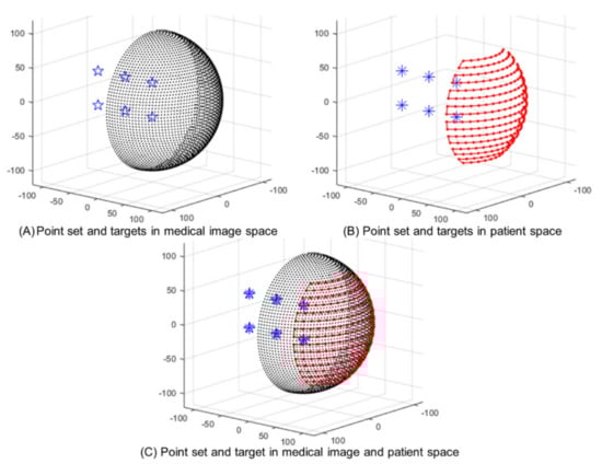 Here, denotes the ith point of the medical image and denotes the ith point of the patient after the transformation is applied. In addition, denotes the location of the target measured in the medical image space, and denotes the points that were generated after applying the transformation matrix of the target measured in the patient space.