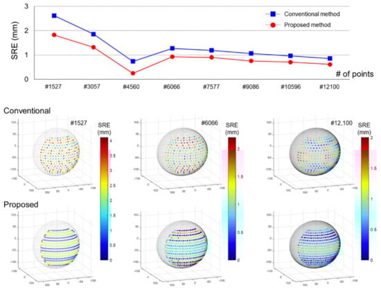 To evaluate the proposed registration method, the initial condition (coarse registration effect) was set to coincide with the origin of the hemisphere model composed of the point sets in the medical image and patient space. The rotation matrix was calculated using the ICP optimization process due to the mismatch between the points in each space. The SRE and TRE values were calculated by transforming the points in patient space (Figure 4 and Figure 5). Compared to the initial condition, the SRE was reduced by approximately 1.3% and 33% for the conventional and proposed method, respectively. As the number of points in the medical image increases, the overall trend of SRE decreases. Overall, the error when the proposed algorithm is applied is reduced by an average of about 0.4 (0.2) mm compared to the error when the conventional registration method is used. When the registration results of the proposed method are visualized, the number of points in patient space increases, but the overall error value decreases (Figure 4).