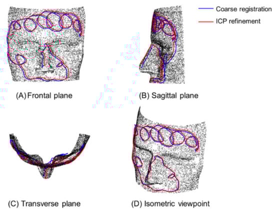 For initial registration (coarse registration) of the point cloud acquired from the medical image and patient space, four coordinate points on the facial surface that could easily be identified were roughly selected. The locations of the four feature points in this study were the tip of the nose, the tips of both eyes, and the glabellar. Subsequently, the transformation matrix (rotation and translation) of the two spaces was extracted using the singular value decomposition method to perform the initial registration. Figure 7 illustrates a typical case of initial registration and shows the difference with ICP precision registration. The difference in the position of the point cloud between the initial registration and the ICP registration in all experimental cases using the plastic facial phantom was found to be about 2 mm on average. Successful initial registration was performed, leading to ICP refinement optimization without local minima.
