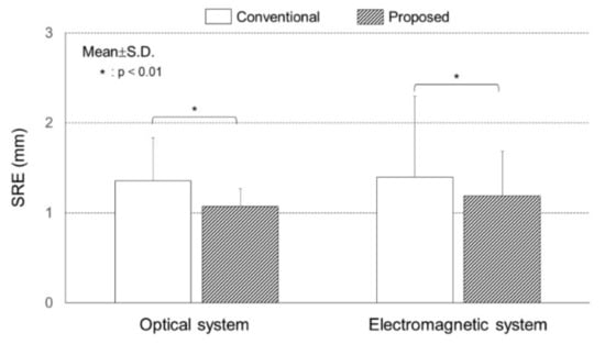 Figure 8 shows a comparison of the results of the conventional and proposed registration methods using experimental data from the plastic facial phantom. For the optical tracking system, the average SRE value using the conventional method was 1.36 mm, while the proposed registration method showed a reduced average SRE value of 1.07 mm and an increase in accuracy of about 21% (p < 0.01). Additionally, the SRE value in the proposed registration method decreased by about 15% compared to the conventional registration method, and the difference was significant (p < 0.01).