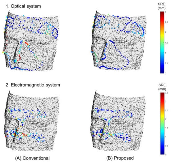 Figure 9 visually illustrates the difference in SRE between the conventional and proposed registration methods for representative experimental data from 20 replications. The colormap shown on the right side of the figure indicates that the SRE increases as the color goes from blue to red (i.e., blue represents zero). Both the optical and electromagnetic tracking systems produced a wide distribution of blue across the facial surface using the proposed registration method compared to the conventional method, and a significant reduction in errors (red). In the rest of the experiments, both the optical and electromagnetic systems produced similar results (color distributions).