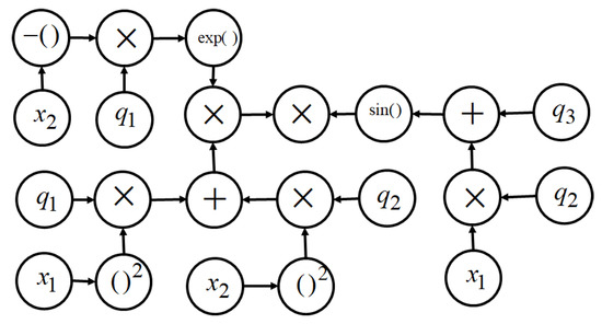 The network operator method (NOP) codes a mathematical expression in the form of oriented graph [15]. Source-nodes correspond to arguments of the mathematical expression, other nodes correspond to functions of two arguments, and arcs correspond to functions with one argument.