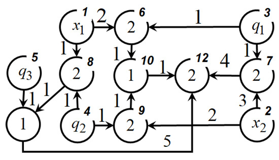 In the graph (Figure 2), numbers near arcs are numbers of functions with one argument. Numbers inside nodes (except source nodes) are numbers of functions with two arguments. Numbers in upper parts of the nodes are the node numbers.