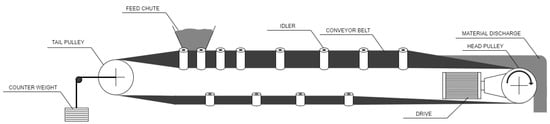 The life of the conveyor belt depends on many factors collected in the literature [1]—among other things, it depends on the type of material transported, the specificity of the transport point as well as the length and age of the conveyor belt. Figure 1 shows the appearance of a conveyor belt used in mining. This device works continuously, transporting the material from the tail pulley to the head pulley. During the operation of the belt conveyor, the belt is passed through both pulleys, changing the running direction on them. Between the pulleys, along its entire length, the belt is supported by sets of idlers. Above the conveyor belt, there is a feet chute, the arrangement and shape of which guarantees the correct arrangement of the discharged material on the conveyor belt and prevents it from spilling out of the belt area. The material is moved along the belt to the head pulley, where the belt direction changes, and the load is thrown outside the area of the belt conveyor [2].