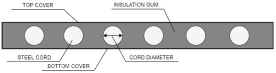 The most important and most frequently damaged part of the conveyor is the conveyor belt. It is estimated that its cost is about 60% of the cost of the entire conveyor [3,4]. Demands for conveyor belts require that the belt be a high-quality product, which in turn translates into its cost. The more important is its diagnosis and quick detection of potential damage when it is possible to remove them because the potential failure of the belt conveyor generates a cost associated not only with its repair, but also associated with forced downtime in transport [3]. Figure 2 shows a diagram of a cross section through a conveyor belt.
