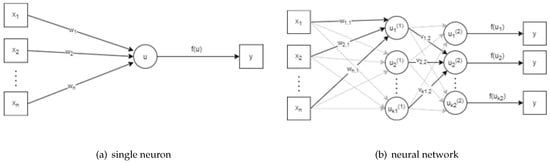 Figure 5a shows the structure of a single neuron, which receives many input values and which produces a single output value. Figure 5b shows a representative network that consists of a hidden layer with neurons. A single neuron works by adding the stimulation signal delivered to its input after multiplying it by the weights assigned to a given input. The summed excitation signal is then transferred to the appropriate activation function, and the value generated by it is the output signal of the neuron [17]. The output signal of the neuron is described by a mathematical relationship represented by the Formula (1):