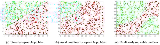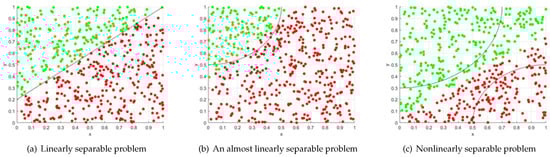 Each of the problems named above has an appropriate interpretation used in the following considerations. In each of these problems, a certain area is designated where the points belonging to a given class are located (in the analyzed case, this area is limited by straight lines; in the case of larger problems, this area is limited by hyperplanes). Thus, in the case of a linearly separable problem, points above a certain line belong to a given class, below the same line they do not belong; in the almost linearly separable problem, the segment of a circle with the center at point , and radius was determined, while, in the nonlinearly separable problem, the area is determined by two segments of a circle with centers at points and radius .
