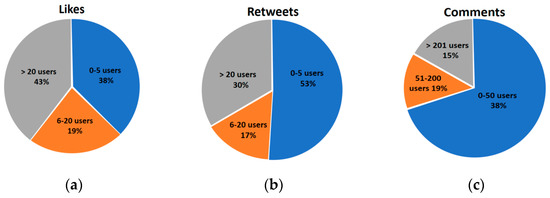 Figure 1. Distributions of number of handles for (a) like, (b) retweet, and (c) comment lists.- ○