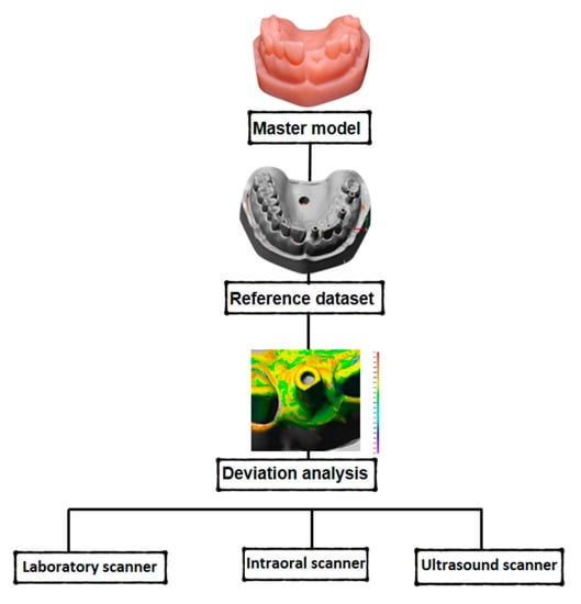 Representation of methodology used in this study. Acrylic-resin cast containing dental implants was digitized for use as reference data set. The scan was performed with ultrasound, laboratory scanner and intraoral scanner. Measurement error was calculated as deviation between scanned cast compared with reference dataset.