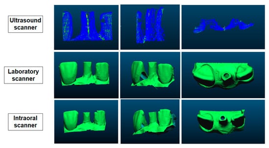 Previous studies have recommended the use of ultrasound to scan dental implants and surrounding tissues [,,,,,]. Recently, a high-frequency ultrasound-based scanner was introduced for scanning teeth [,,,]. According to Marotti et al. (2019), the mean deviation value of ultrasound images ranged from 12.34 to 46.38 µm, and its accuracy was comparable with that obtained by commercially available optical scanners.