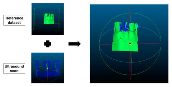 Alignment of ultrasound scans (blue) with the reference dataset (green).