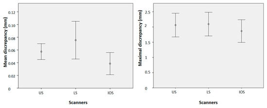 Mean and maximal discrepancy values obtained by ultrasound (US), laboratory scanner (LS) and intraoral scanner (IOS). No statistically significant difference was found between the scanners for the mean and maximal discrepancy values.