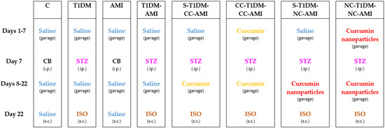 Flow chart demonstrating the experimental study groups. Abbreviations: C—control; AMI—acute myocardial infarction; T1DM—type 1 diabetes mellitus; S—saline (0.09%); CC—conventional curcumin; NC—solution of curcumin nanoparticles; CB—citrate buffer; i.p.—intraperitoneal; STZ—streptozotocin; s.c.—subcutaneous; ISO—isoproterenol.
