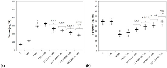 Serum blood glucose and C-peptide levels: (a) glucose; (b) C-peptide. C—control; AMI—acute myocardial infarction; T1DM—type 1 diabetes mellitus; S—saline (0.09%); CC—conventional curcumin solution (200 mg/Kg bw); NC—solution of curcumin nanoparticles (200 mg/Kg bw). The letters correspond to p values <0.05: (a) S-T1DM-CC-AMI compared to AMI; (b) S-T1DM-CC-AMI compared to T1DM; (c) S-T1DM-CC-AMI compared to T1DM-AMI; (A) CC-T1DM-CC-AMI compared to AMI; (B) CC-T1DM-CC-AMI compared to T1DM; (C) CC-T1DM-CC-AMI compared to T1DM-AMI; (D) CC-T1DM-CC-AMI compared to S-T1DM-CC-AMI; (x) S-T1DM-NP-AMI compared to AMI; (y) S-T1DM-NP-AMI compared to T1DM; (z) S-T1DM-NP-AMI compared to T1DM-AMI; (t) S-T1DM-NP-AMI compared to S-T1DM-CC-AMI; (X) NP-T1DM-NP-AMI compared to AMI; (Y) NP-T1DM-NP-AMI compared to T1DM; (Z) NP-T1DM-NP-AMI compared to T1DM-AMI; (T) NP-T1DM-NP-AMI compared to CC-T1DM-CC-AMI; (U) NP-T1DM-NP-AMI compared to S-T1DM-NP-AMI.