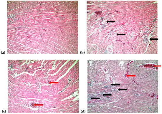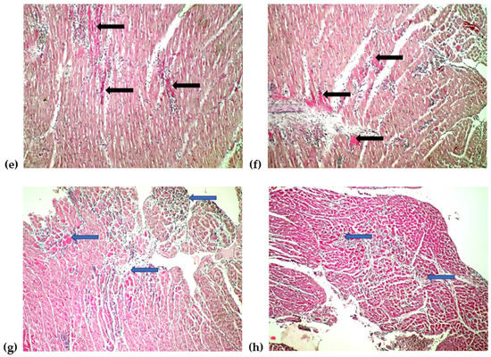 Histopathological examinations of the heart tissue. (a) C (normal architecture of the myocardium), (b) AMI (multifocal necrosis associated with diffuse infiltration with leukocytes (black arrow)), (c) T1DM (blood stasis with well recognizable integral erythrocytes in a congested blood vessel (red arrow)), (d) T1DM-AMI (multifocal necrosis associated with diffuse infiltration with leukocytes (black arrow), and blood stasis (red arrow)), (e) S-T1DM-CC-AMI (multifocal necrosis with inflammatory infiltration of leukocytes), (f) CC-T1DM-CC-AMI (multifocal necrosis with inflammatory infiltration of leukocytes), (g) S-T1DM-NC-AMI (subendocardial necrosis with inflammatory infiltration of leukocytes (blue arrows)), (h) NC-T1DM-NC-AMI (subendocardial necrosis with inflammatory infiltration of leukocytes (blue arrows)).