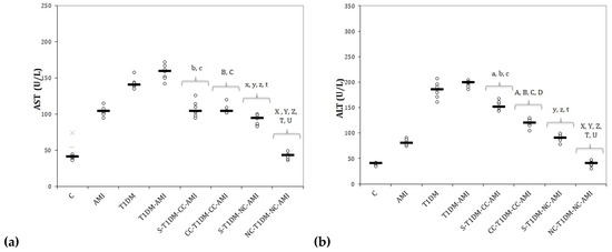 Serum levels of liver function parameters: (a) Aspartate transaminase (AST); (b) Alanine transaminase (ALT). C—control; AMI—acute myocardial infarction; T1DM—type 1 diabetes mellitus; S—saline (0.09%); CC—conventional curcumin solution (200 mg/Kg bw); NC—solution of curcumin nanoparticles (200 mg/Kg bw). The letters correspond to p values <0.05: (a) S-T1DM-CC-AMI compared to AMI; (b) S-T1DM-CC-AMI compared to T1DM; (c) S-T1DM-CC-AMI compared to T1DM-AMI; (A) CC-T1DM-CC-AMI compared to AMI; (B) CC-T1DM-CC-AMI compared to T1DM; (C) CC-T1DM-CC-AMI compared to T1DM-AMI; (D) CC-T1DM-CC-AMI compared to S-T1DM-CC-AMI; (x) S-T1DM-NP-AMI compared to AMI; (y) S-T1DM-NP-AMI compared to T1DM; (z) S-T1DM-NP-AMI compared to T1DM-AMI; (t) S-T1DM-NP-AMI compared to S-T1DM-CC-AMI; (X) NP-T1DM-NP-AMI compared to AMI; (Y) NP-T1DM-NP-AMI compared to T1DM; (Z) NP-T1DM-NP-AMI compared to T1DM-AMI; (T) NP-T1DM-NP-AMI compared to CC-T1DM-CC-AMI; (U) NP-T1DM-NP-AMI compared to S-T1DM-NP-AMI.