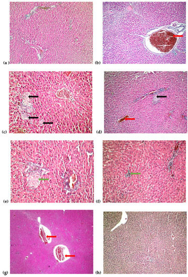 Histopathological examinations of the liver tissue. (a) C (normal architecture of the liver), (b) AMI (blood stasis with well recognizable integral erythrocytes in a congested blood vessel (red arrow)), (c) T1DM (multifocal micronecrosis (black arrow)), (d) T1DM-AMI (lobular micronecrosis (black arrow) and blood stasis (red arrow)), (e) S-T1DM-CC-AMI (focal necrosis (green arrow)), (f) CC-T1DM-CC-AMI (focal necrosis (green arrow)), (g) S-T1DM-NC-AMI (blood stasis with well recognizable integral erythrocytes in a congested blood vessel (red arrow)), (h) NC-T1DM-NC-AMI (normal architecture of the liver).