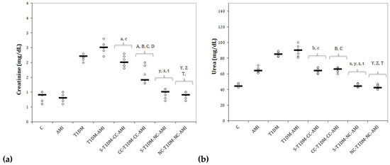 Serum levels of kidney function parameters: (a) Creatinine; (b) Urea. C—control; AMI—acute myocardial infarction; T1DM—type 1 diabetes mellitus; S—saline (0.09%); CC—conventional curcumin solution (200 mg/Kg bw); NC—solution of curcumin nanoparticles (200 mg/Kg bw). The letters correspond to p values <0.05: (a) S-T1DM-CC-AMI compared to AMI; (b) S-T1DM-CC-AMI compared to T1DM; (c) S-T1DM-CC-AMI compared to T1DM-AMI; (A) CC-T1DM-CC-AMI compared to AMI; (B) CC-T1DM-CC-AMI compared to T1DM; (C) CC-T1DM-CC-AMI compared to T1DM-AMI; (D) CC-T1DM-CC-AMI compared to S-T1DM-CC-AMI; (x) S-T1DM-NP-AMI compared to AMI; (y) S-T1DM-NP-AMI compared to T1DM; (z) S-T1DM-NP-AMI compared to T1DM-AMI; (t) S-T1DM-NP-AMI compared to S-T1DM-CC-AMI; (Y) NP-T1DM-NP-AMI compared to T1DM; (Z) NP-T1DM-NP-AMI compared to T1DM-AMI; (T) NP-T1DM-NP-AMI compared to CC-T1DM-CC-AMI.