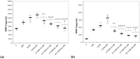Serum levels of matrix metalloproteinases: (a) Matrix metalloproteinase 2 (MMP-2); (b) matrix metalloproteinase 9 (MMP-9). C—control; AMI—acute myocardial infarction; T1DM—type 1 diabetes mellitus; S—saline (0.09%); CC—conventional curcumin solution (200 mg/Kg bw); NC—solution of curcumin nanoparticles (200 mg/Kg bw). The letters correspond to p values <0.05: (b) S-T1DM-CC-AMI compared to T1DM; (c) S-T1DM-CC-AMI compared to T1DM-AMI; (A) CC-T1DM-CC-AMI compared to AMI; (B) CC-T1DM-CC-AMI compared to T1DM; (C) CC-T1DM-CC-AMI compared to T1DM-AMI; (D) CC-T1DM-CC-AMI compared to S-T1DM-CC-AMI; (x) S-T1DM-NP-AMI compared to AMI; (y) S-T1DM-NP-AMI compared to T1DM; (z) S-T1DM-NP-AMI compared to T1DM-AMI; (t) S-T1DM-NP-AMI compared to S-T1DM-CC-AMI; (X) NP-T1DM-NP-AMI compared to AMI; (Y) NP-T1DM-NP-AMI compared to T1DM; (Z) NP-T1DM-NP-AMI compared to T1DM-AMI; (T) NP-T1DM-NP-AMI compared to CC-T1DM-CC-AMI; (U) NP-T1DM-NP-AMI compared to S-T1DM-NP-AMI.
