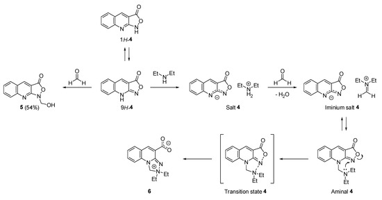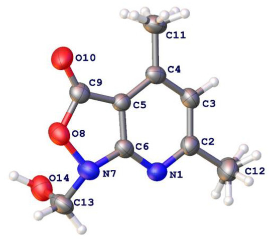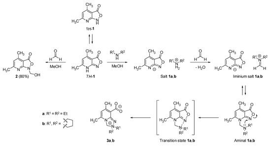 First, we have proved that 4,6-dimethylisoxazolo[3,4-b]pyridin-3(1H)-one (1) undergoes 1,2 nucleophilic addition in a reaction with formaldehyde to afford hemiaminal 2, the structure of which was unambiguously confirmed by single crystal X-ray analysis (Figure 1). According to our previous studies, the same reaction performed in the presence of secondary amine (HNR1R2) gives rise to the formation 2,2-dialkyl-5,7-dimethyl-2,3-dihydro-[1,2,4]triazolo[4,3-a]pyridin-2-ium-8-carboxylates (3a,b), i.e., Safirinium P dyes, by means of the tandem Mannich—electrophilic amination reaction [4]. Hence, acidic isoxazolone 1 in the presence of a base forms salts 1a,b which further react with formaldehyde to yield iminium salts 1a,b. Furthermore, the ambident nucleophile and iminium cations give the Mannich addition products (aminals 1a,b) that spontaneously undergo electrophilic amination reactions via the transition states 1a,b affording products 3a,b in a quantitative manner.