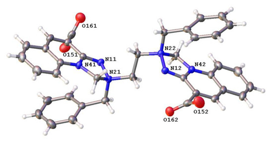 Crystal data for 8b (C38H32N6O4·5H2O, M = 726.77 g/mol): triclinic, space group P-1 (no. 2), a = 16.5969(5) Å, b = 18.1134(4) Å, c = 19.4666(6) Å, α = 104.252(2)°, β = 95.940(3)°, γ = 105.512(2)°, V = 5374.9(3) Å3, Z = 6, T = 131 K, μ(CuKα) = 0.806 mm−1, Dcalc = 1.347 g/cm3, 52232 reflections measured (4.762° ≤ 2Θ ≤ 136.5°), 19659 unique (Rint = 0.0341, Rsigma = 0.0394) which were used in all calculations. The final R1 was 0.0563 (I > 2σ(I)) and wR2 was 0.1561 (all data). One of the carboxylate groups and one of the ethylene bridges are disordered over two sites. The molecule of 8b is shown in Figure 4.